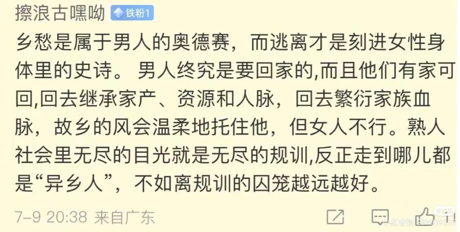 眼下,在女生中广泛流传的一句话是,“乡愁是属于男人的奥德赛,逃离是刻进女性身体里的史诗。”