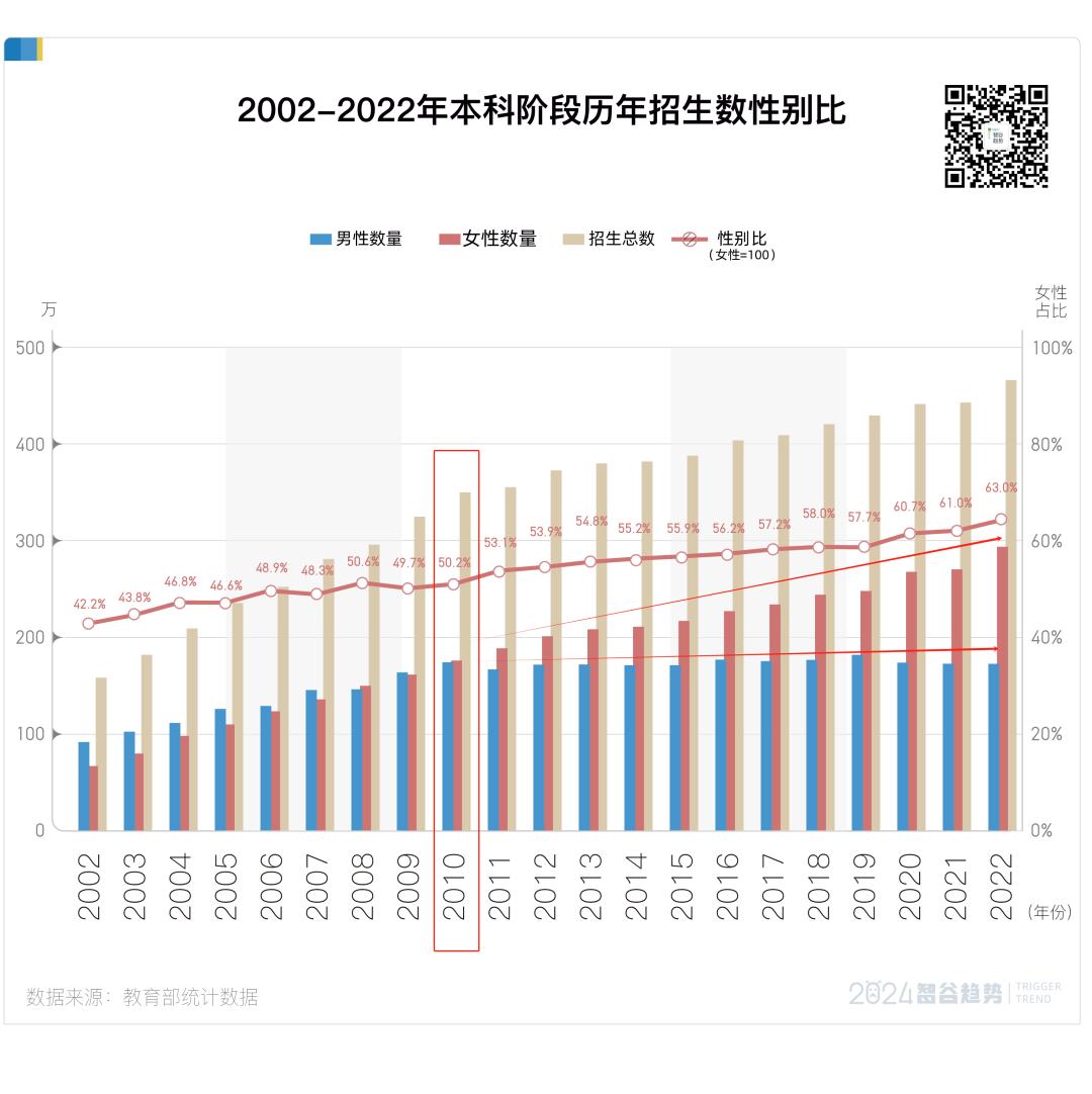 2022年,本科阶段招生数女性占比达到历史最高的63%。