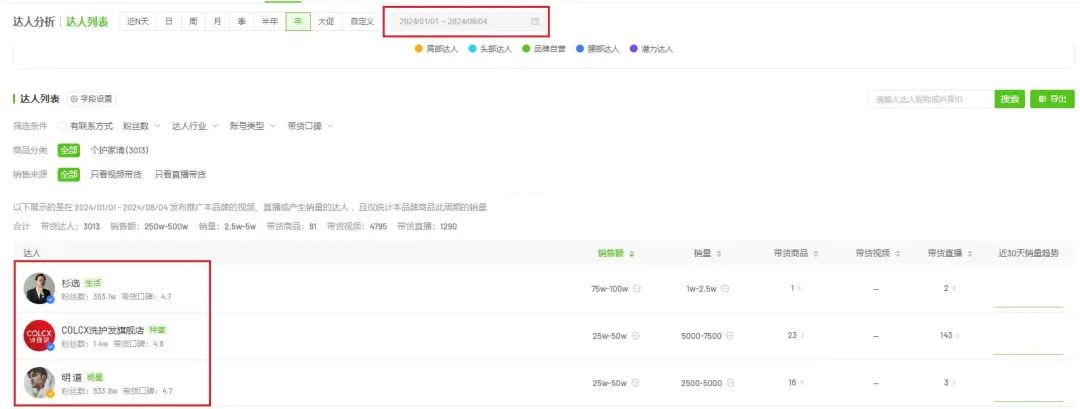 青眼通过飞瓜数据(抖音版)了解到,COLCX/诗理研目前在抖音上与多个达人进行了合作。今年1月至今,该品牌已与3000多位达人进行了合作,其中包括视频种草和直播带货等,这当中销售额最高的达人为“杉选”,其在今年内为诗理研带货的总销量为“1W-2.5W”,总销售额为“75w-100W”。明道则是排在第三位,数据显示其为诗理研带货的总销售为“2500-5000”,总销售额为“25w-50w”。