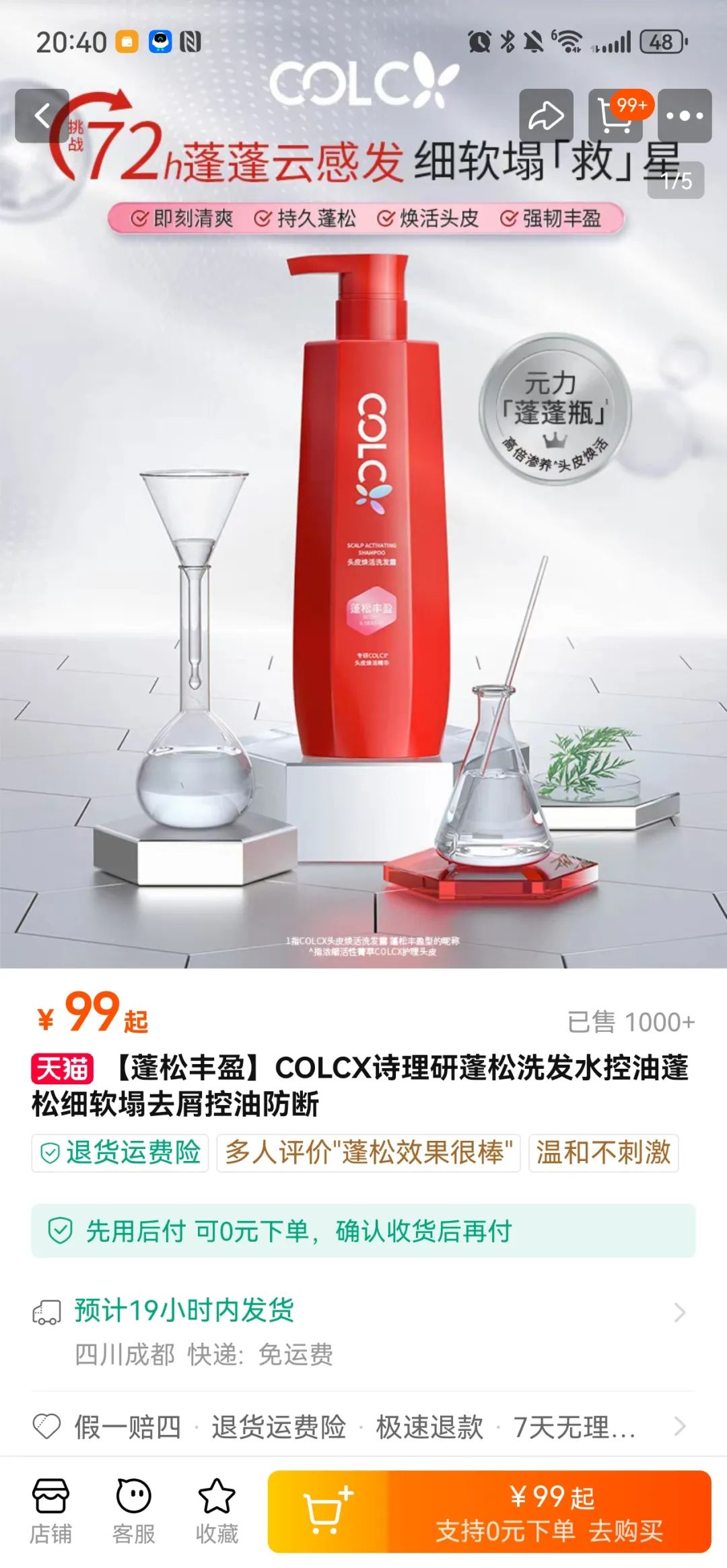 天猫平台上,COLCX诗理研旗舰店粉丝数为1.5万,该店铺中销售最的高的产品为COLCX诗理研蓬松洗发水,产品售价为99元/件,该产品链接显示“已售1000+”件。