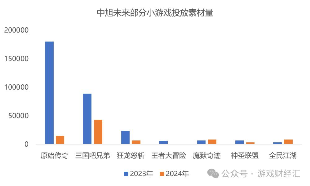 DataEye-ADX的数据显示,中旭未来今年在小游戏的投放策略更为审慎,今年小游戏素材投放量还不到去年全年的30%。特别是去年表现强劲的《原始传奇》,今年的投放量显著减少,从超过18万组降至1.4万组,后者属于中等水平。