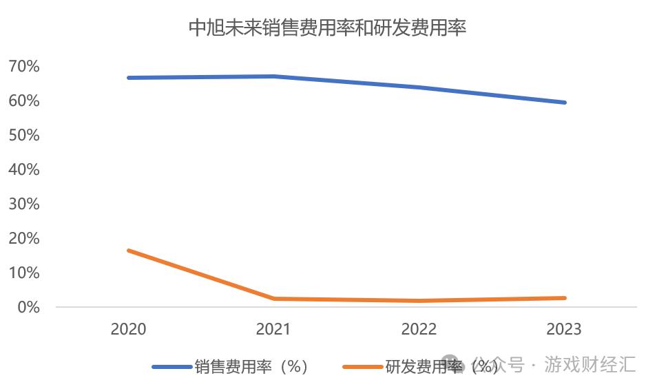 2023年,中旭未来销售费用达38.8亿元,销售费用率接近60%。销售费用率虽有所下滑,但仍维持在较高水平。目前中旭未来的销售费用率超过三七,是国内销售费用率最高的游戏股之一。