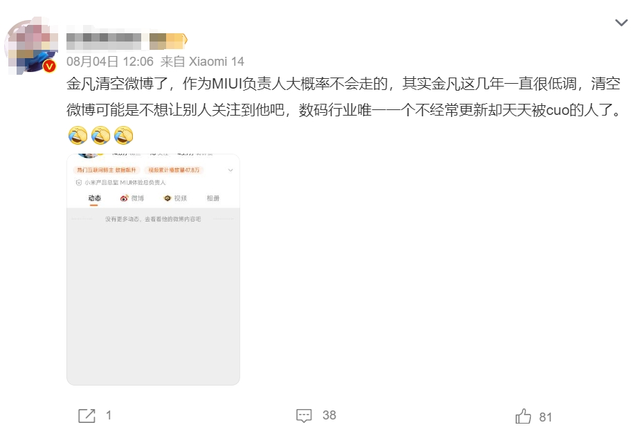 更有意思的地方在于,“金凡离职”的消息并非出自小米官方或是其他内部人士,而是因为有网友发现金凡的微博已经清空了所有内容,看起来就像是跑路后为了避嫌,清空社交账号一样。