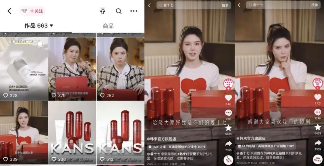 为了实现内容利用率最大化,韩束把短剧内容“有机融合”到品牌在抖音全链路的流量池中。在姜十七合作短剧上线引爆的时候,韩束在抖音的信息流广告、搜索广告、效果广告、千川广告全部都引用了短剧的剧情,甚至直播间内的背景墙、KV板,都绑定了短剧剧情和场景。