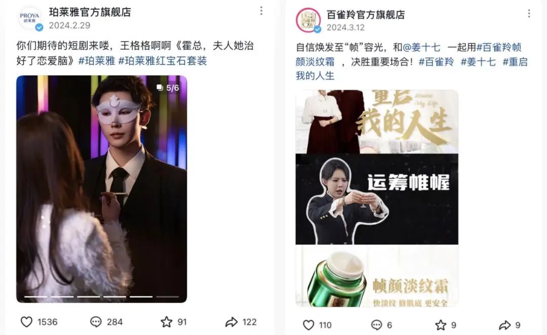 不单是与姜十七合作的短剧,以上所有的达人定制短剧,都不只在达人账号播出,还会被品牌账号及其他个人账号转发或做成切片视频。