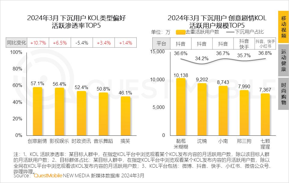 根据QuestMobile的《2024下沉市场洞察报告》数据显示,截止2024年3月,我国下沉用户规模达6.47亿,在整个移动互联网大盘中的占比达到52.6%,对各行业的流量起到支撑作用。且下沉用户对短视频平台更为偏爱,在其偏好观看的TOP5 KOL类型中,创意剧情排名第一。