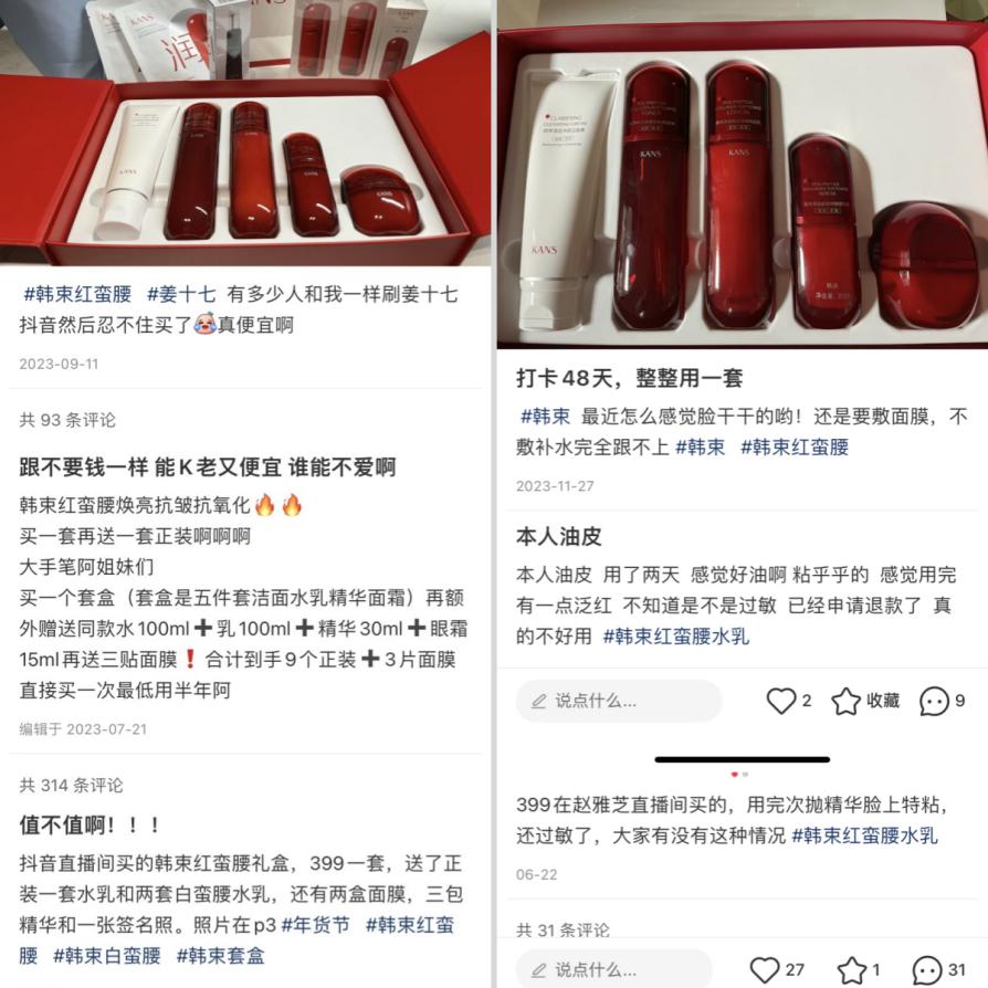 一方面,小红书平台上,韩束红蛮腰的口碑分化明显,在多为“物美价廉”的好评同时,也有不少用户反馈使用后皮肤过敏、长痘,越用脸越干等。另一方面,红蛮腰还被质疑“抄袭”,从瓶身设计、瓶体颜色、产品名称都与资生堂旗下的“红腰子”高度相似。