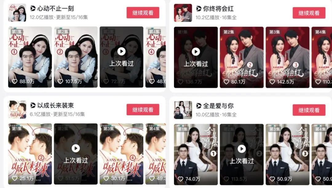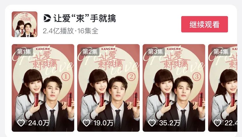 2023年3月,韩束和抖音头部达人姜十七合作推出品牌短剧《以成长来装束》,随后又在9月之前陆续推出了《心动不止一刻》《一束阳光一束爱》《全是爱与你》《你终将会红》四部短剧,这些短剧每部16集左右,均以“甜宠”为核心,向观众提供情绪刺激,并在剧中植入韩束主打抗老功效的红蛮腰套装。