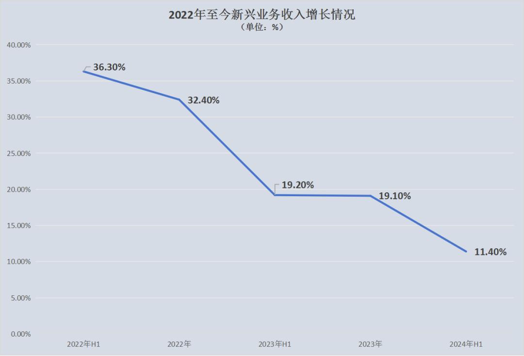 进入2024年后,新兴业务收入增速进一步下滑,从2023年19%左右的增速“断崖式”下降至11%左右。具体来看,2024年上半年,新兴业务收入同比增长11.4%。与此同时,新兴业务对整体收入增长的拉动作用也不断削弱,2024年上半年拉动电信业务收入增长2.7个百分点。
