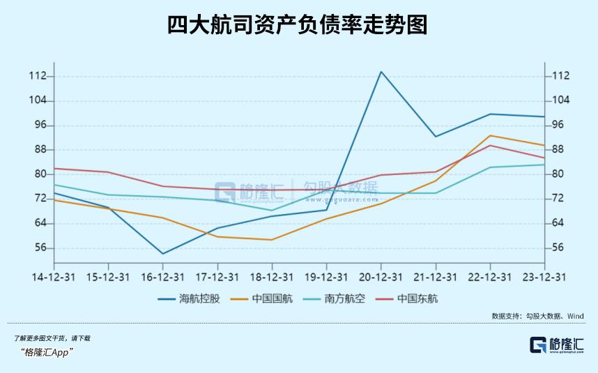 疫情之前,四大航司的净资产差别不算大——2019年,国航为935亿元,东航为668亿元,南航为639亿元,海航为522亿元。但几年疫情之后,海航被远远甩开了。截止今年一季度末,海航的净资产仅27.6亿元,其余三大航司均超过370亿元。