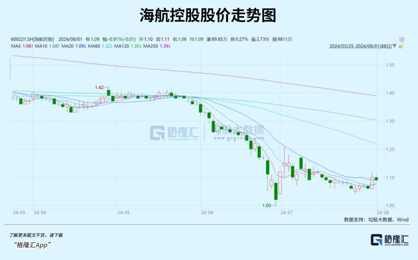 不过,该增持计划对股价影响不大。随后几个交易日,海航继续下跌,且在7月25日报收1.06元。