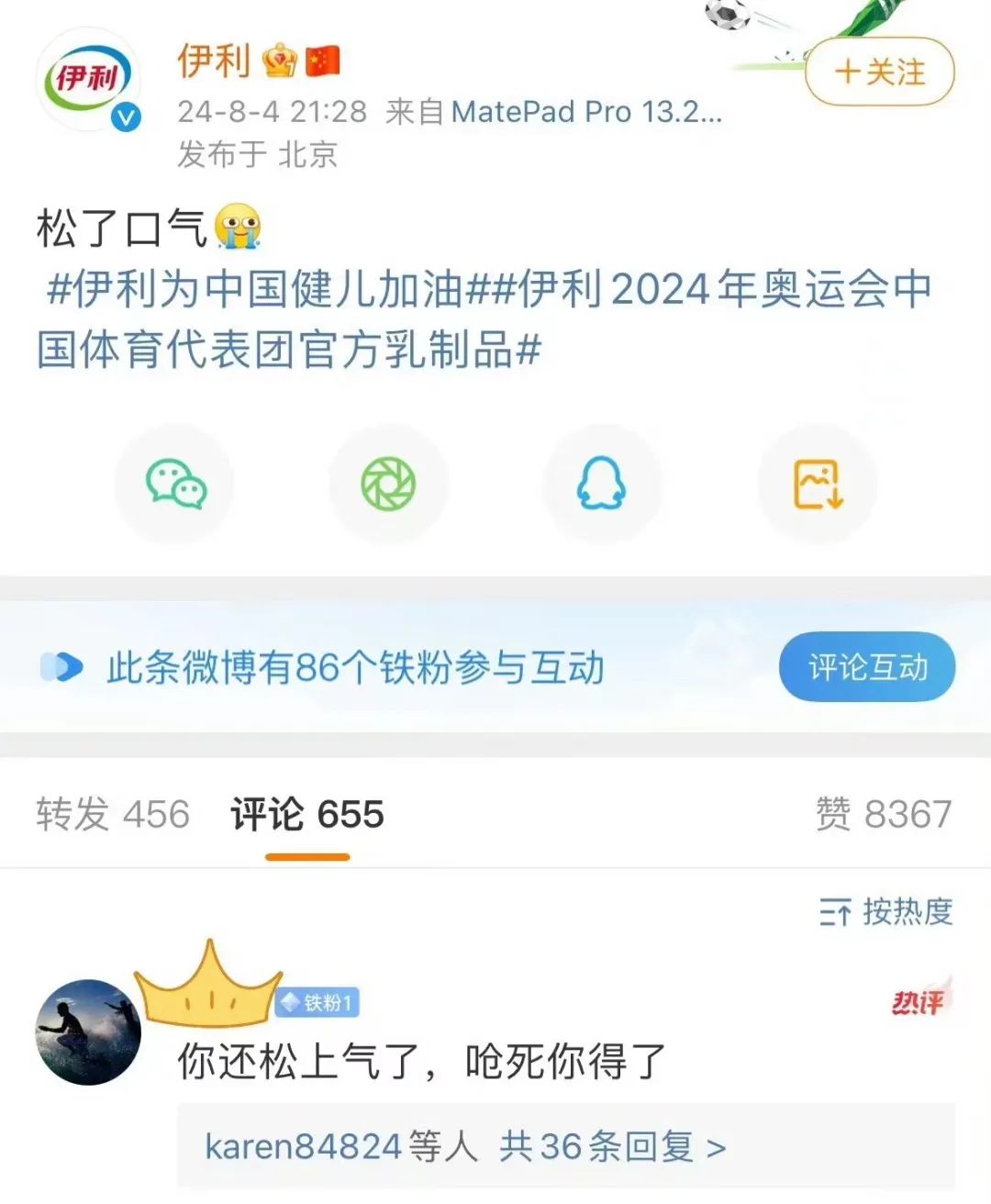 在男乒决赛期间,伊利发微博表示“松了口气”。但是,在该条微博评论区下,樊振东粉丝却并不买单,认为伊利提前“毒奶”,质疑品牌运营不够严谨,更因此影响粉丝对品牌的好感度。
