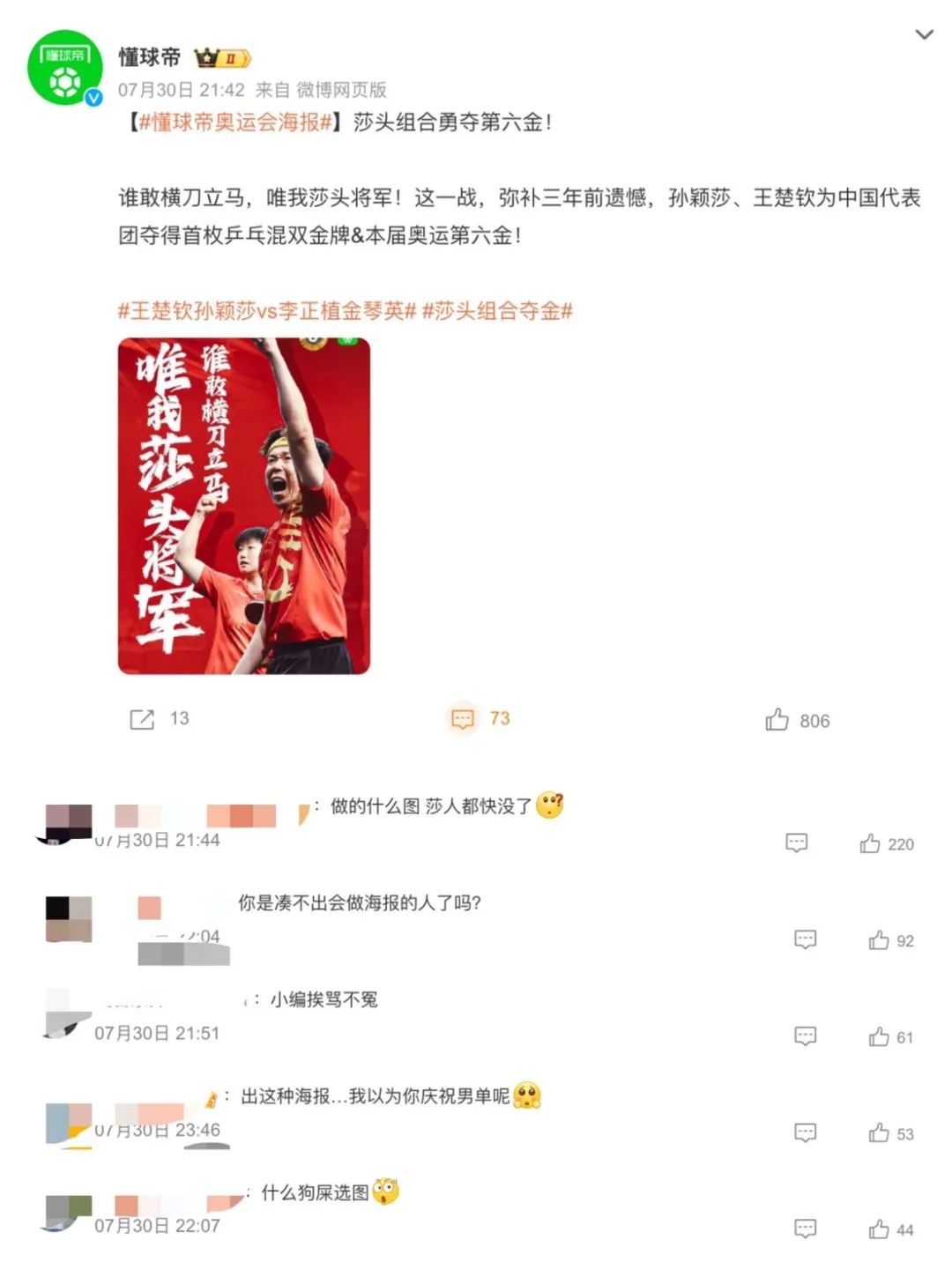 也有饭圈争端以女性议题的形式展现出来。在孙颖莎、王楚钦混双夺得金牌后,一众品牌纷纷发布海报祝贺。没想到的是,孙颖莎粉丝对懂球帝等平台释出的海报表达出强烈不满,“孙颖莎人都快没了”、“出这种海报,还以为是在庆祝男单夺冠”......原本只是博流量的举动,却最终招致骂名。
