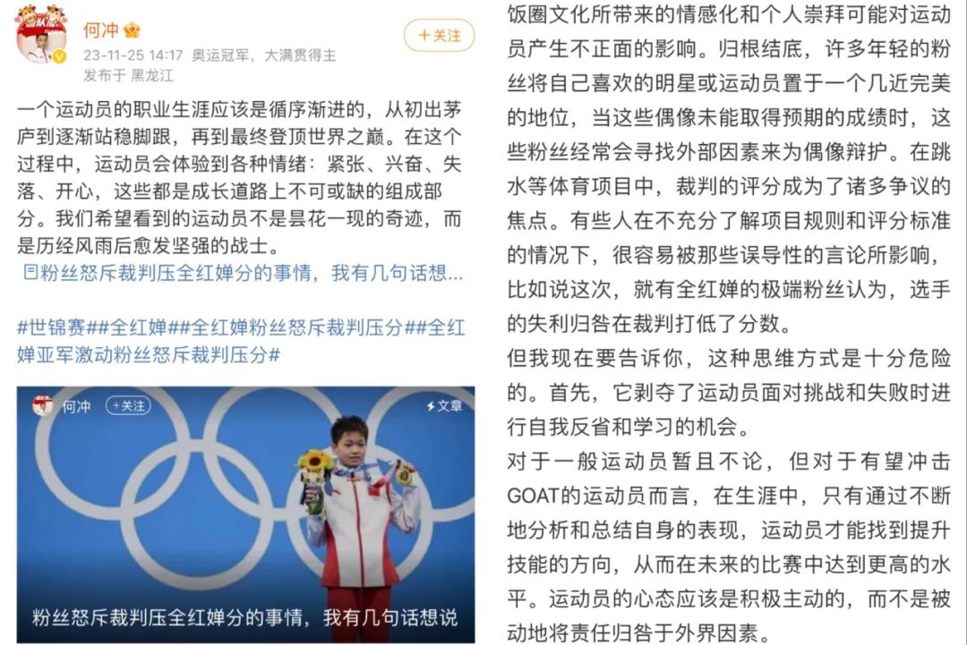 2023年全国跳水锦标赛10米台决赛中,陈芋汐以近9分的优势力压全红婵夺冠。成绩出来后,一位粉丝在看台上大吼裁判不公,社交媒体上也出现大量对陈芋汐乃至其家人的攻击,导致陈芋汐不得不删除大量动态和评论。事后,奥运冠军何冲也不禁发长文驳斥这种近乎疯狂的饭圈文化。