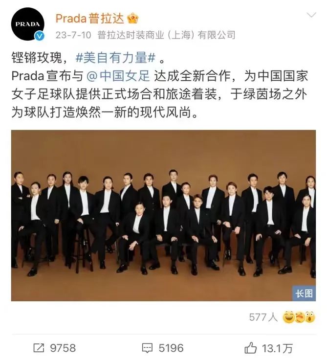 品牌选择与运动员合作,首要目的是为品牌故事加分,其次是博取流量。运动员代表的拼搏、向上的大众形象,能够为品牌形象带来增益效果。以奢侈品牌Prada为例,在流量明星上多次摔跟头的Prada从2022年开始转变策略,为巩立姣、杨舒予等运动员提供定制服饰。直至2023年,Prada官宣成为中国女足官方合作伙伴。中国女足的正面形象,不仅成功逆转Prada在大众舆论层面的口碑,体育运动员的安全性和稳妥性也帮助Prada走出流量明星塌房的循环陷阱。