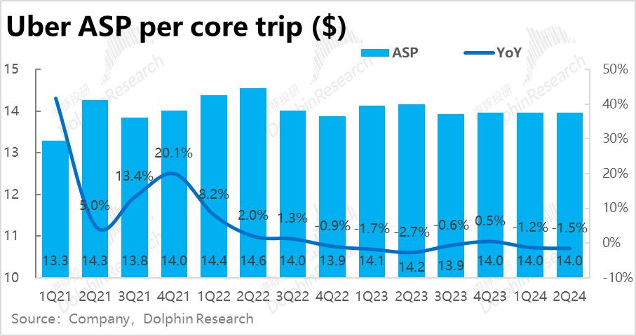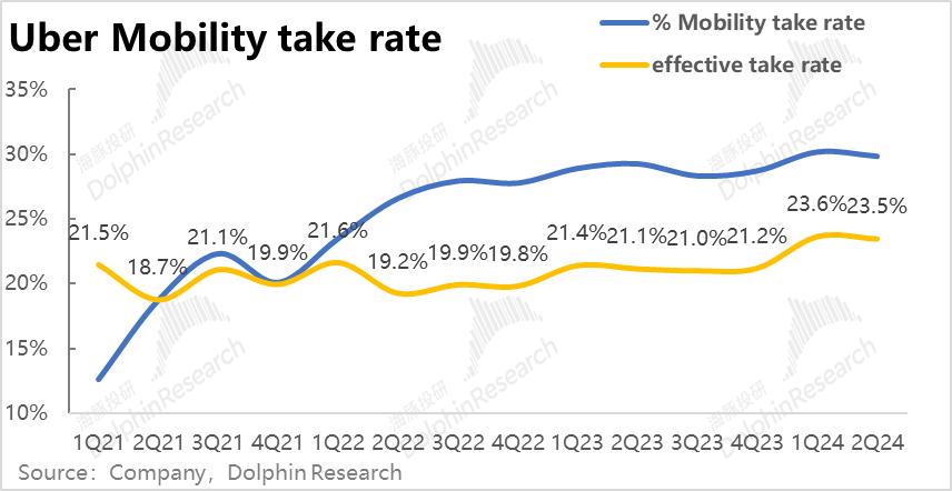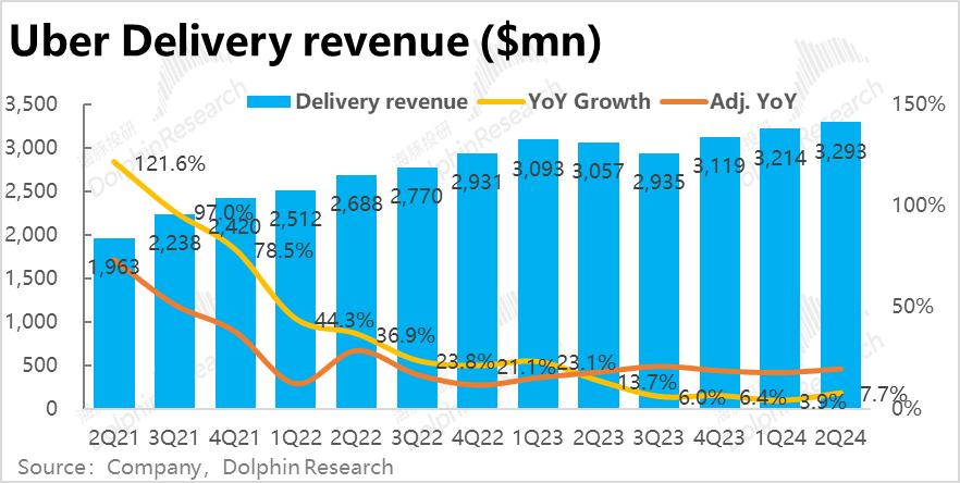 外卖业务本季的收入为32.9亿,同比增长8%,较上季提速了4pct。收入加速增长,主要归功于变现率的走高。剔除1P、3P模式变更的影响,本季的可比变现率为15.4%较上季提高了0.3pct。海豚投研认为,外卖业务变现率的走高,主要是归功于Uber广告业务的增长。据公司披露,广告收入目前的年化收入已达$10亿,