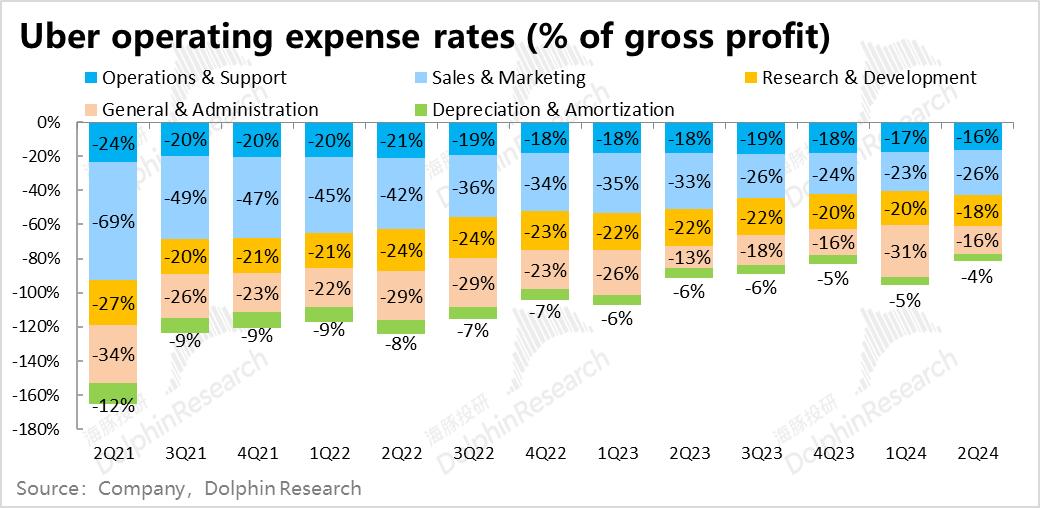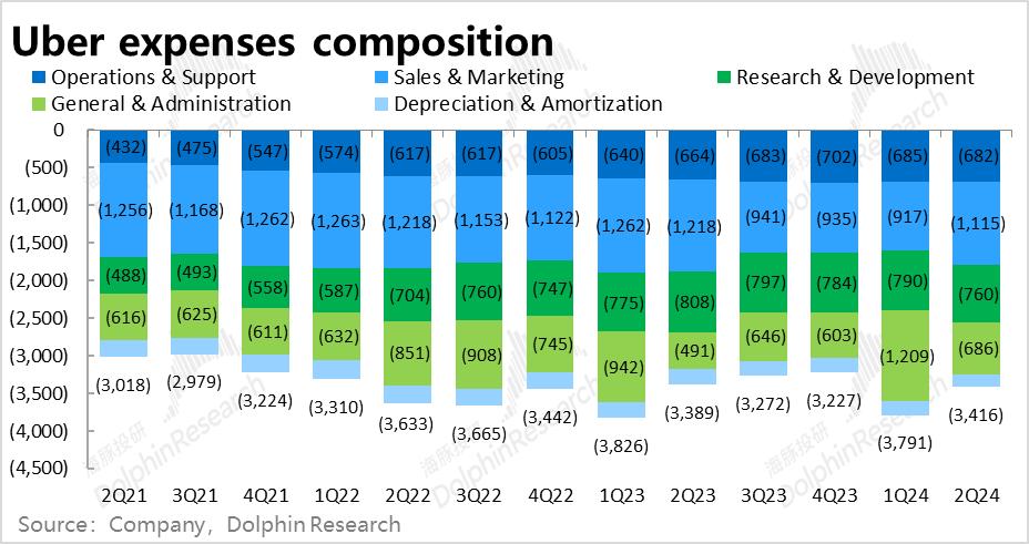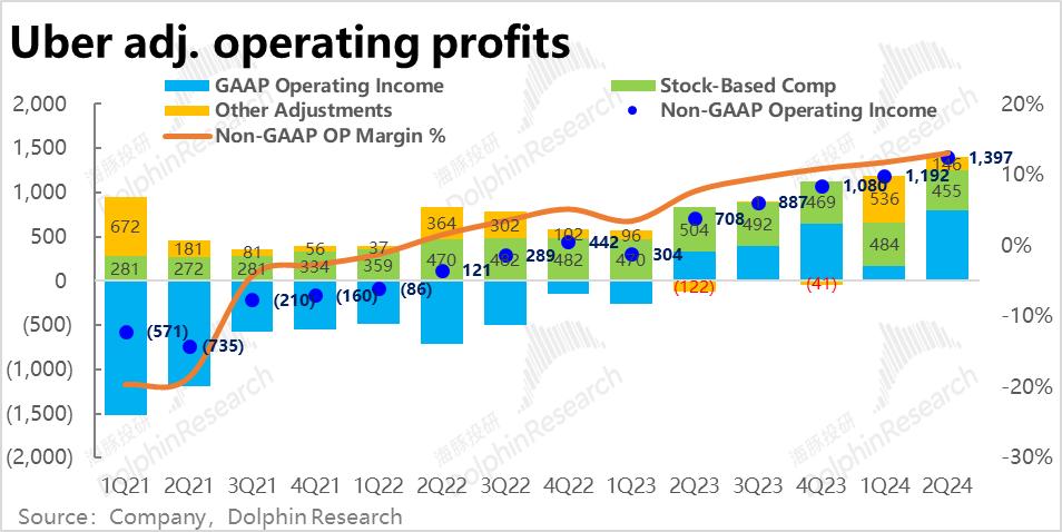 但不看预期差,虽然总费用金额已重新增长,但依旧属于被更快的收入增长摊薄的趋势内。加回股权激励和其他非现金支出的调整后,Uber本季调整后的经营利润为近$14亿。调整后经营利润率达13.1%,较上季提升了1.3pct。