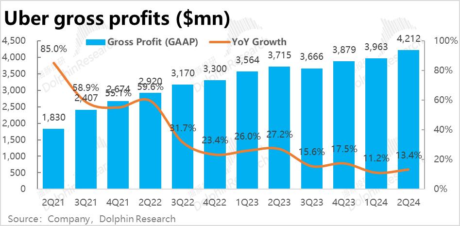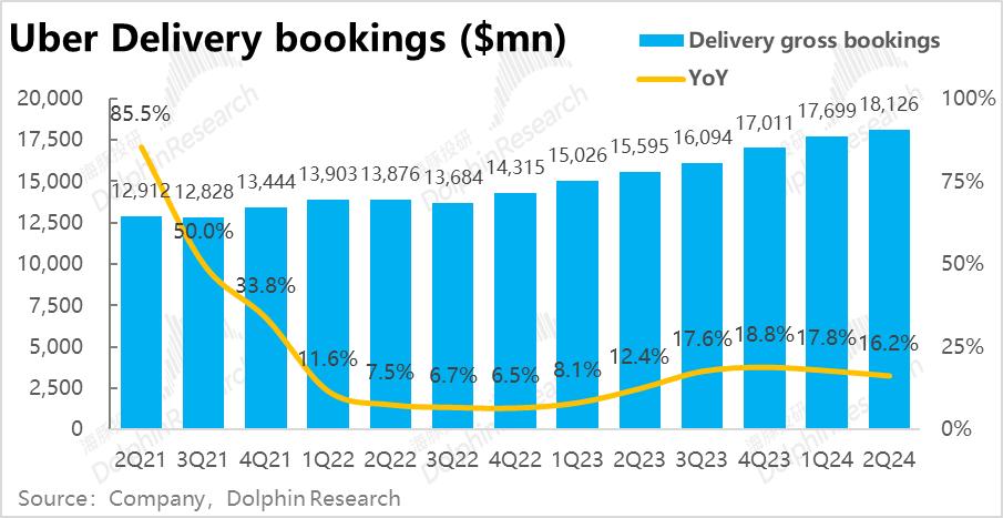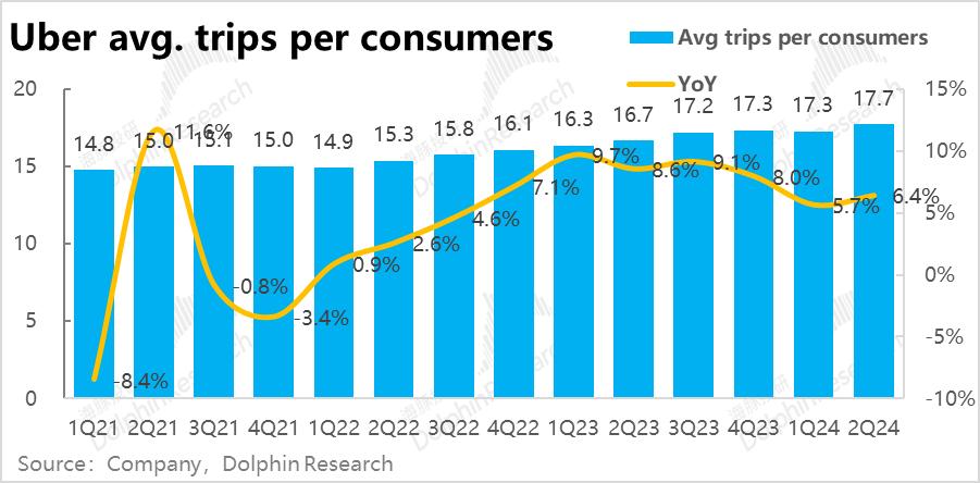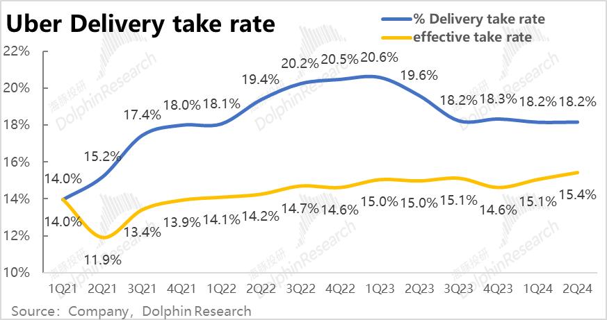 外卖业务的收入为32.9亿,同比增长8%,较上季提速4pct。收入加速增长,主要归功于可比变现率(剔口径变更影响后)为15.4%较上季提高了0.3pct。海豚投研认为,变现率的走高,主要是因为Uber广告业务的增长。据公司披露,广告收入目前的年化收入已达$10亿。
