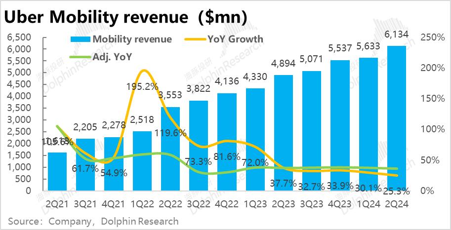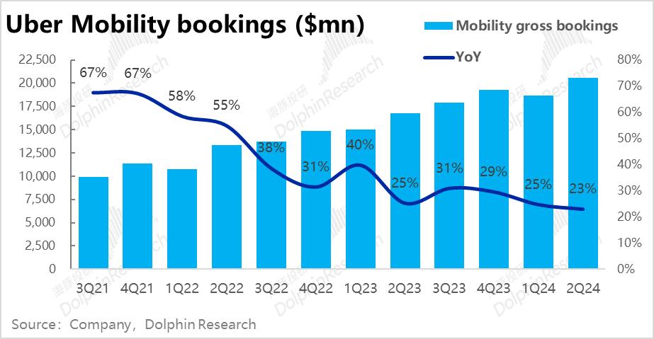 最反映真实经营状况的订单额指标(GTV)上,基石的打车(Mobility)业务,本季订单金额约206亿,比预期略高1%。同比增速为22.9%,看似比上季度继续放缓1.7pct,但实际剔除美元升值的拖累后,恒定汇率下增速为27%,环比实际提升了1pct。