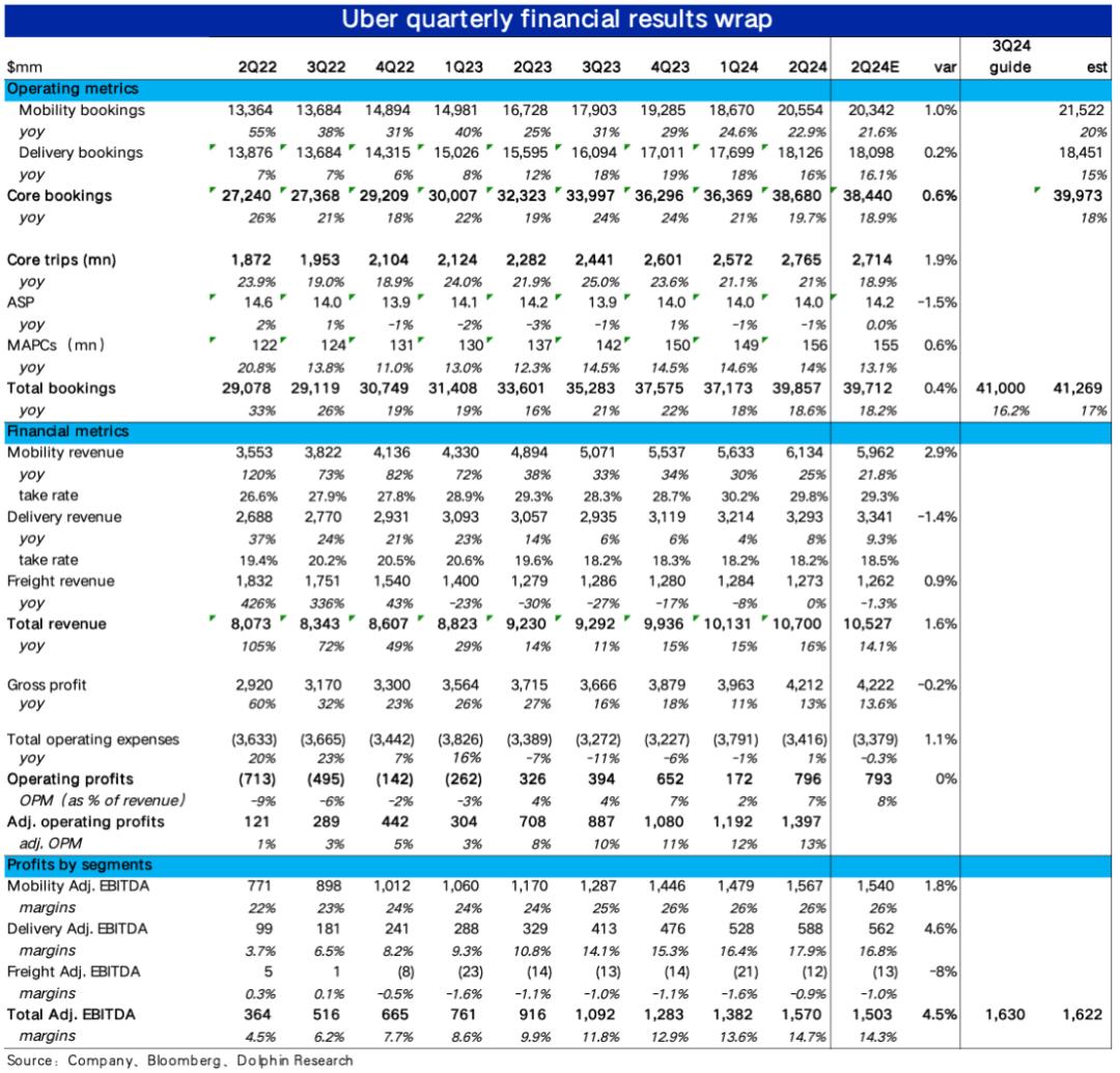 北京时间8月6日晚美股盘前,“国际滴滴”Uber公布了2024年二季度财报,整体来看,核心的打车和外卖业务订单金额增速环比基本持平,并未放缓;主要利润指标adj.EBITDA利润率也继续小幅提高。虽无大惊喜,但有小确幸的业绩,详细要点如下: