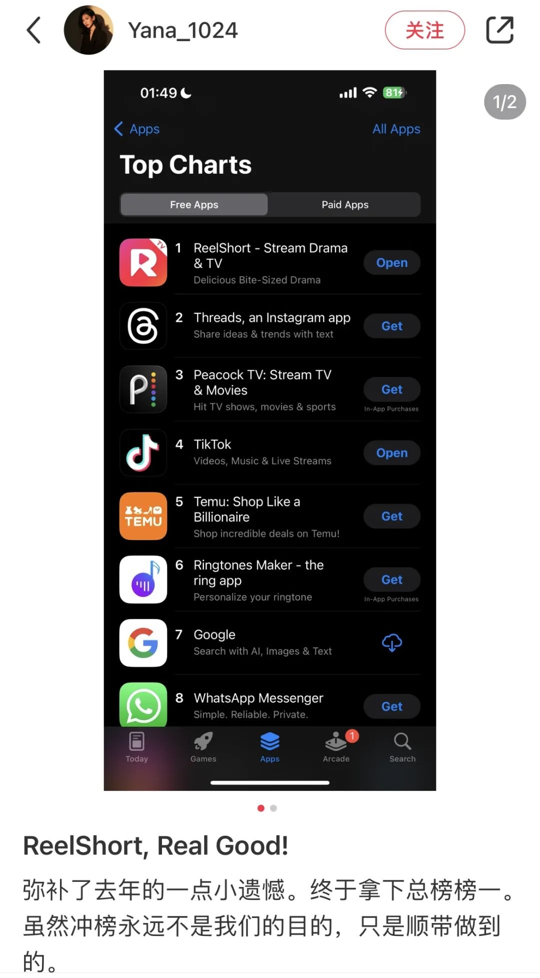 值得一提的是,凭借《The Double Life of My Billionaire Husband》《Fated To My Forbidden Alpha》等多部爆款短剧,ReelShort曾登上美国IOS免费榜第一的宝座,风头一度盖过Tiktok,可见短剧在海外的火爆程度。