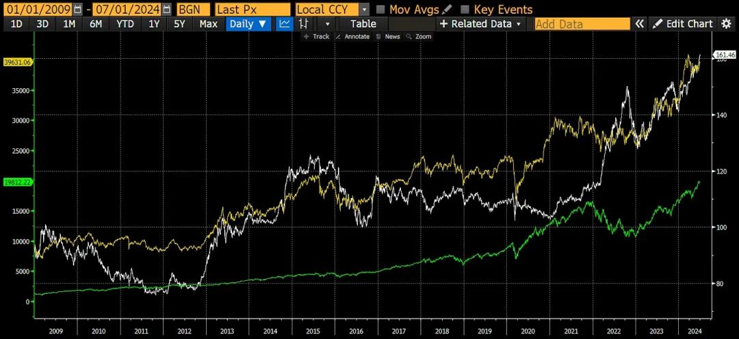 美元兑日元(白色)上升,这意味着日元相对于美元贬值了。 它还带动了纳斯达克 100 指数(绿色)和日经 225 指数(黄色)一起上涨
