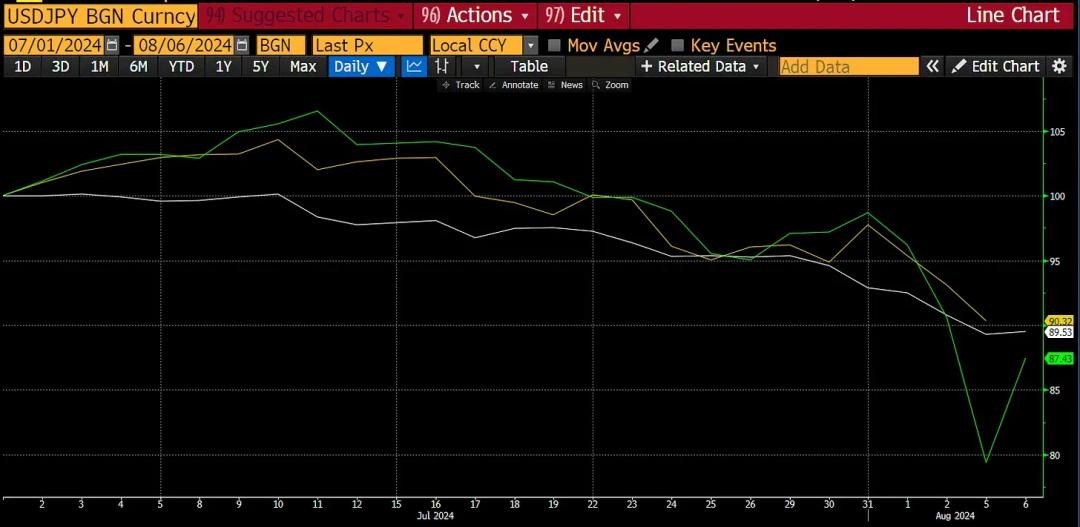 这是日元的升值。套利交易的解除导致全球协调性的金融资产抛售,因为日元债务随着每一笔交易变得更加昂贵,必须偿还。