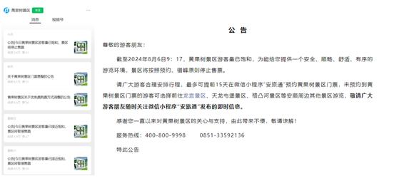 连日来,黄果树瀑布景区门票发布公告:景区游客量已饱和,因此停止售票。