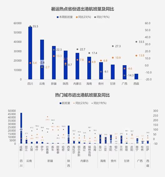 云南、广西航班量同比19年、23年皆下降。