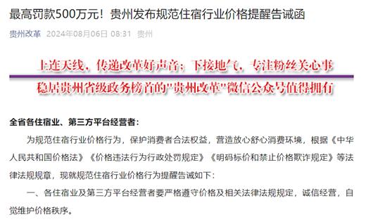 贵州市场监督管理局也火速“听劝”,8月6日发布了规范住宿行业价格提醒告诫函,就规范住宿行业价格行为,对全省各住宿业、第三方平台经营者发出提醒告诫。
