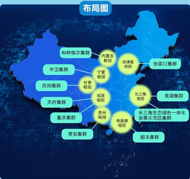 2022年2月,中国正式启动建设八大国家算力枢纽节点,分别为京津冀枢纽、长三角枢纽、粤港澳大湾区枢纽、成渝枢纽、内蒙古枢纽、贵州枢纽、甘肃枢纽、宁夏枢纽。