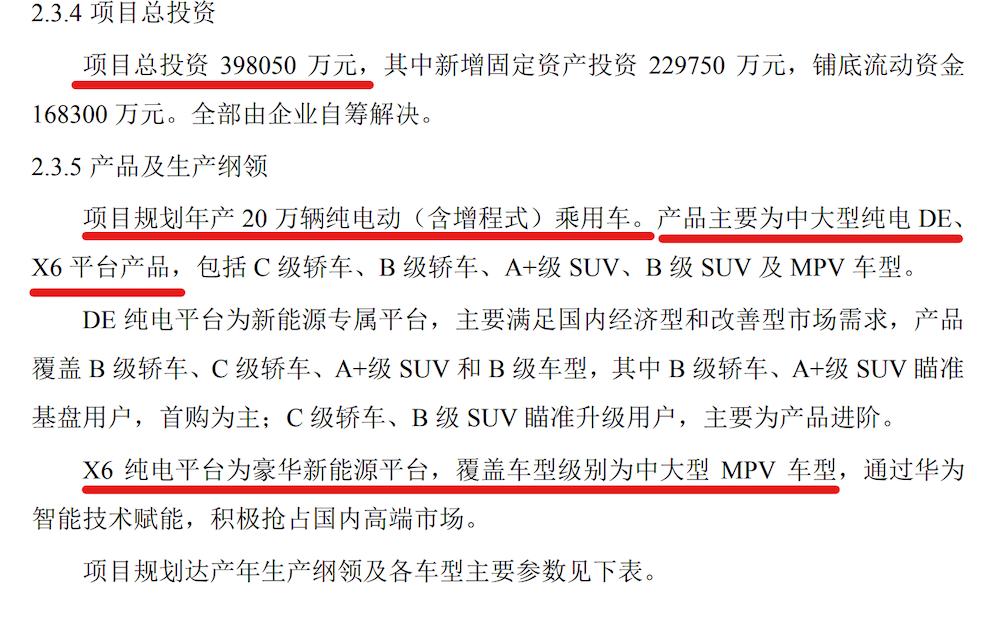 今年3月,安徽省生态环境厅公示了《江淮年产20万辆中高端智能纯电动乘用车建设项目环境影响报告书》,《报告书》中的信息显示该工厂预计年产量20万辆,将开发江淮汽车全新的新能源专属DE平台、华为智能技术赋能的X6平台。