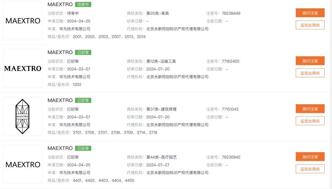 此外,华为还提交了多个与“MAEXTRO”相关的商标注册申请,这些商标具有不同的配色方案和字体风格。