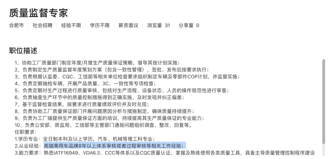 从岗位要求来看,质量相关的岗位需要具备高端乘用车品牌8年以上体系审核或者过程审核等相关工作经验。