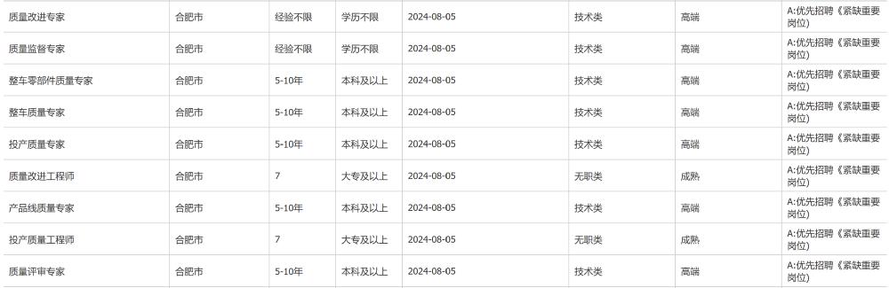 从江淮汽车的招聘网站上可以看出,目前江淮待招岗位包括质量体系专家、质量评审专家、产品线质量专家、投产质量专家、整车质量专家、整车零部件质量专家、质量监督专家、质量改进专家等。