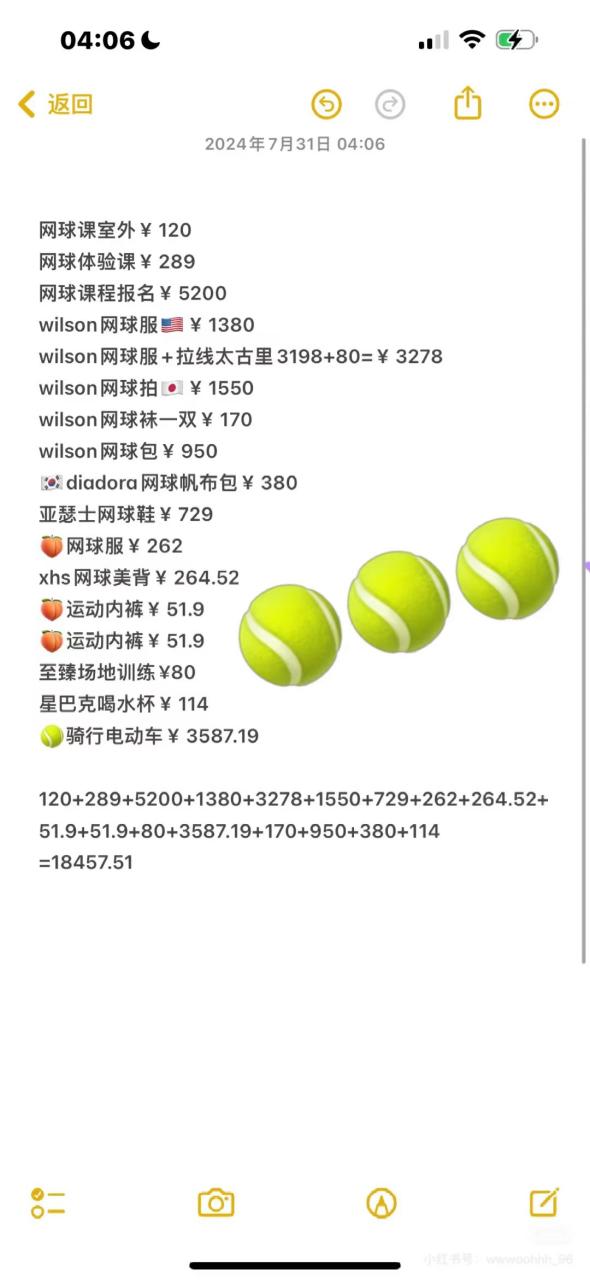 一位自诩为“女屌丝”的小白博主就在小红书上分享了自己暑期学网球的支出,主要分为三个部分,课程、设备和服装。