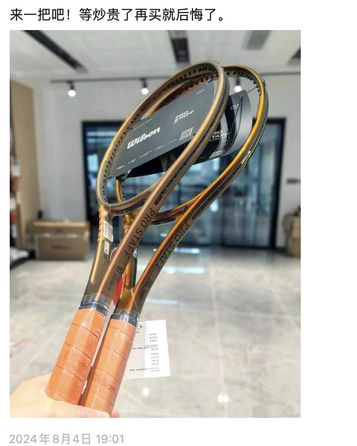 决赛夜一位北京海淀的网球教练非常开心,也在朋友圈提前摆摊,晒出郑钦文夺冠使用的网球拍型号Wilson Pro PRO STAFF 97/290,兜售道:“来一把吧!等炒贵再买就后悔了。”
