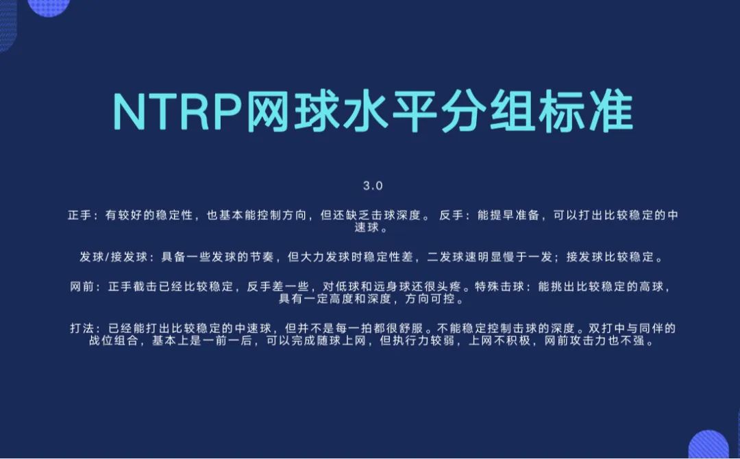 2.5和3.0,则是网球爱好者的两道坎。达到2.5,意味着你掌握了基本的规则和技术,可以和对手拉球。3.0,意味着你可以稳定的发球、击球,可以和球友相约打球、比赛。