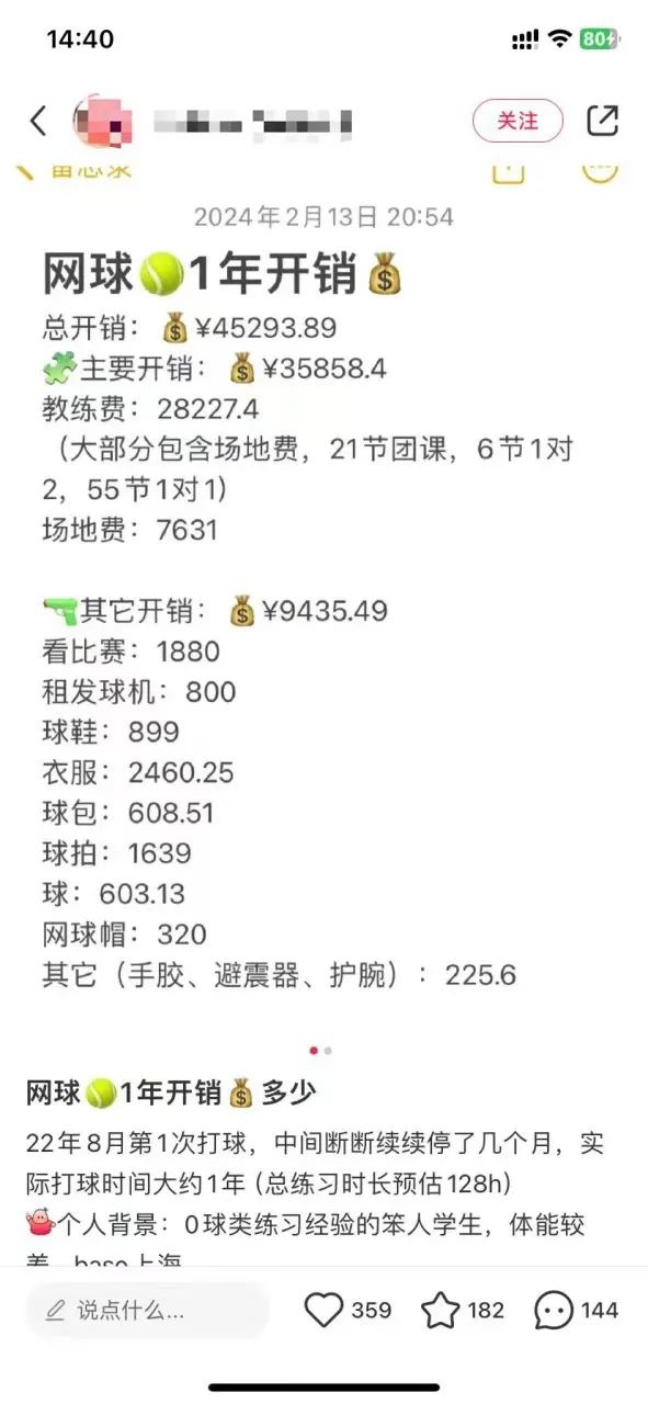 还有0经验起步的博主分享了她学习网球一年的开销,也超过了4.5万元。其中,场地费和教练费的开销就超过了3.5万元。