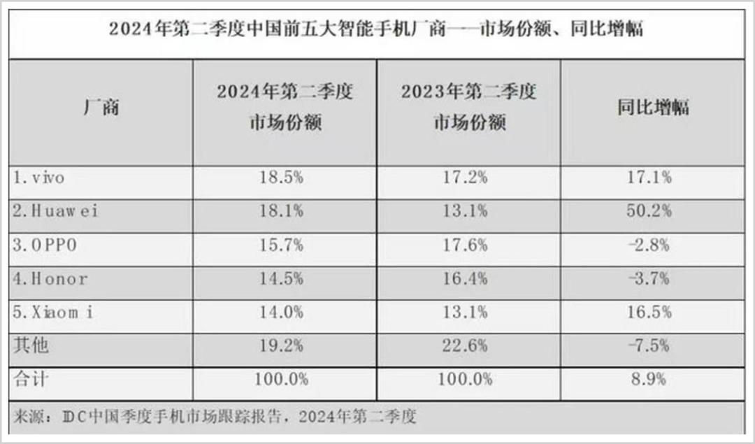 根据Counterpoint Research此前的数据,2024年一季度,iPhone在中国的销量一度下降近20%,直接跌出国内手机市场前五,排在其前列的分别是OPPO、荣耀、华为、vivo和小米等中国品牌。进入二季度,在中国智能手机市场出货量同比增长8.9%的背景下,iPhone中国区销量继续下滑,vivo、华为、OPPO、荣耀、小米等国产品牌则继续包揽前五。