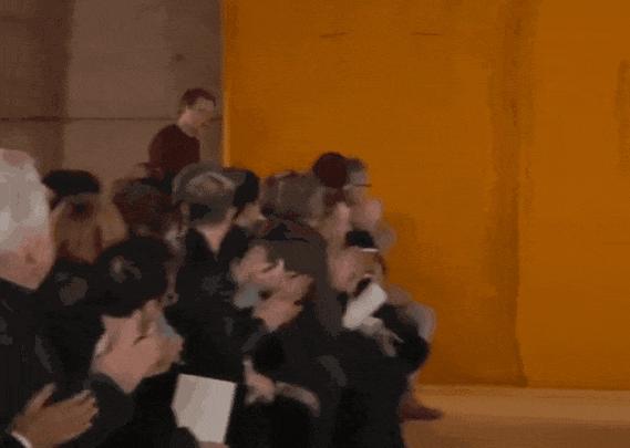 他每次的秀场致谢都很“社恐”,经常穿着最朴素牛仔裤、深色上衣,脚上随便蹬一双鞋就亮相,仿佛过多的穿搭对他来说是个累赘。走上台时,他往往锁着脖子微微弯着背,“偷感”十足,只求尽快完事。