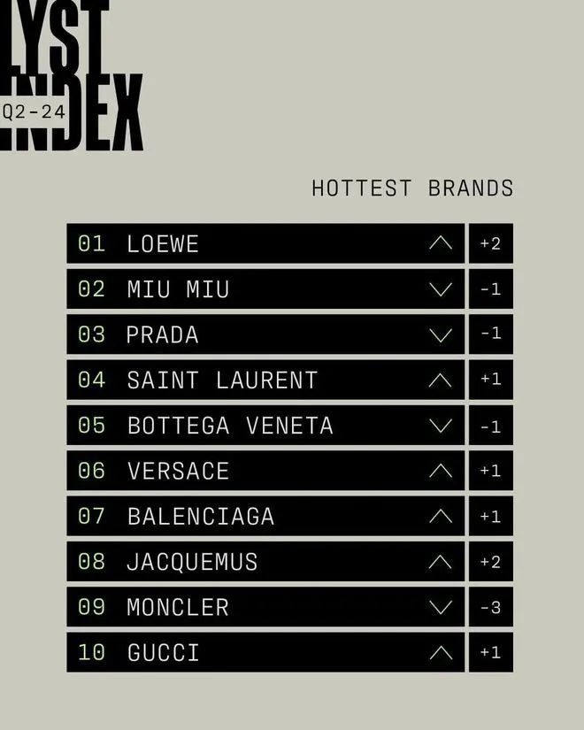 当Loewe取代多季度霸榜的Miu Miu和Prada,登顶2024年Q2全球最热门品牌后,人们给它想了这么一句台词。