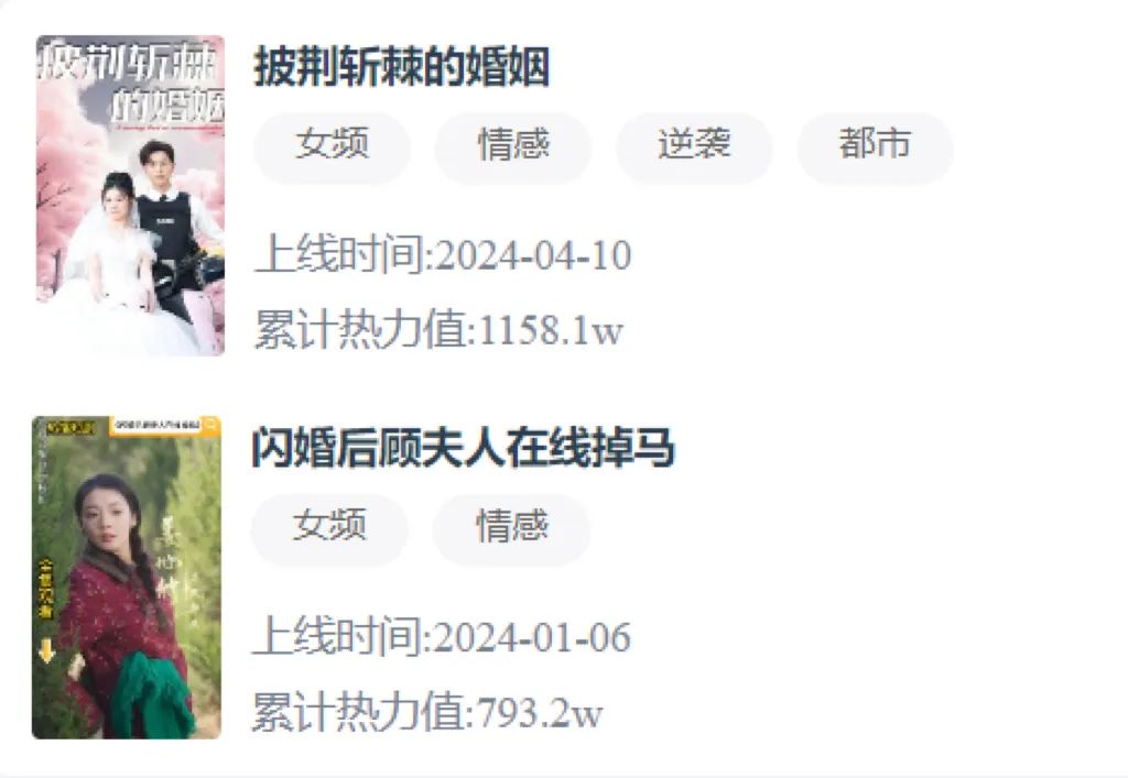 《天降舅舅,亿万总裁放肆宠》《闪婚后,总裁夫妇马甲藏不住》《歌手2024之天后归来》等多部短剧上半年累计热力值超千万,其中《热辣滚烫的婚姻》《不够相爱的我们》热力值超2000W。
