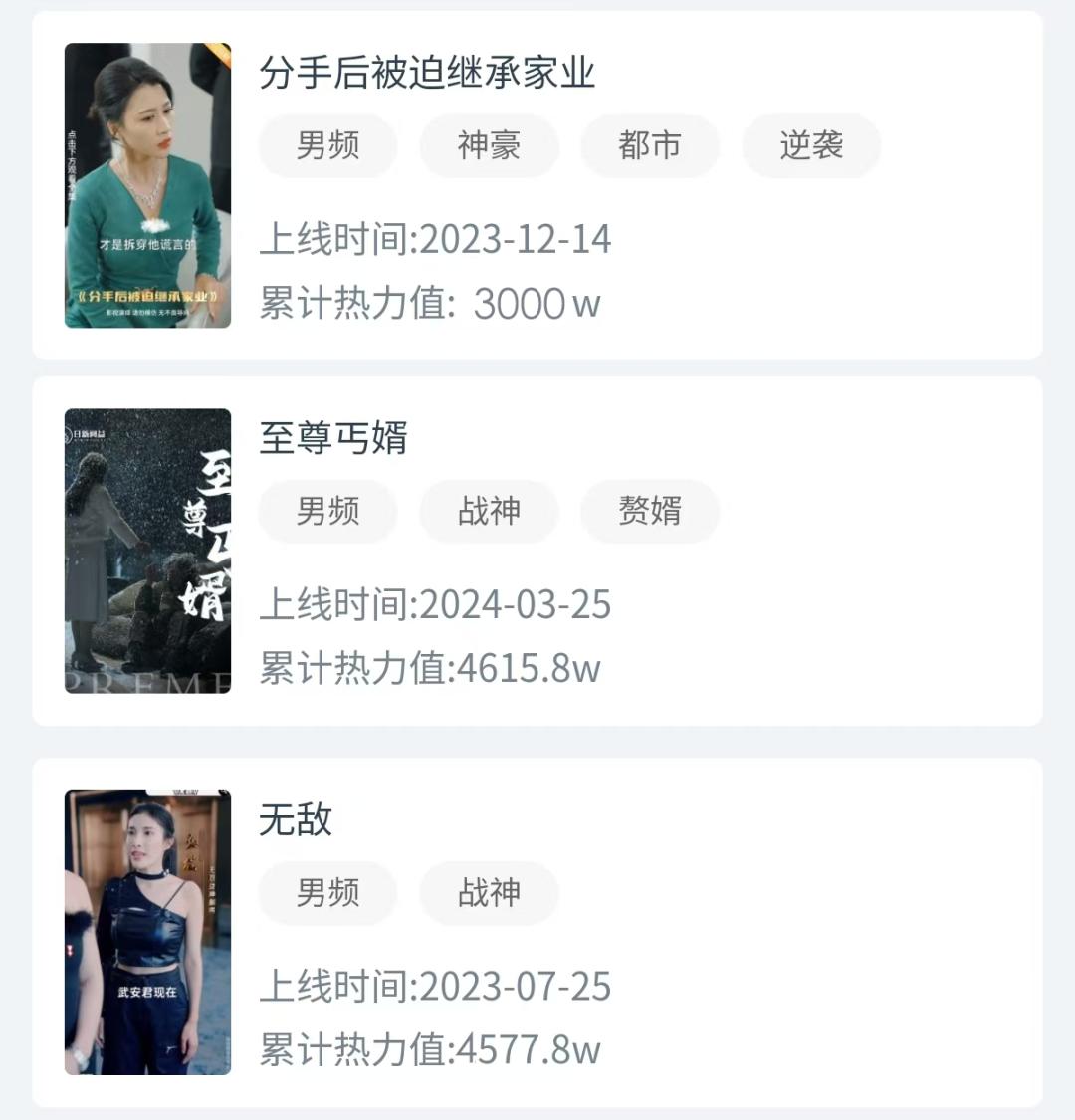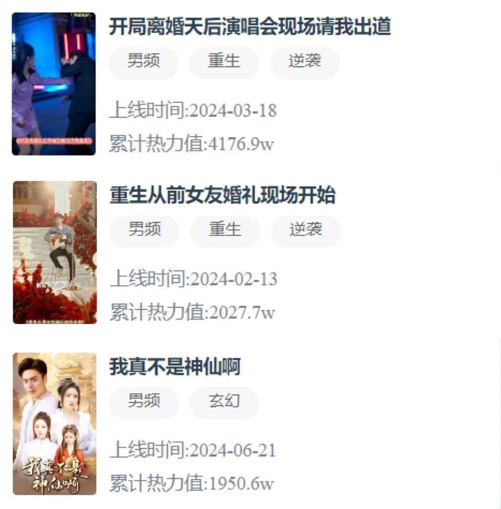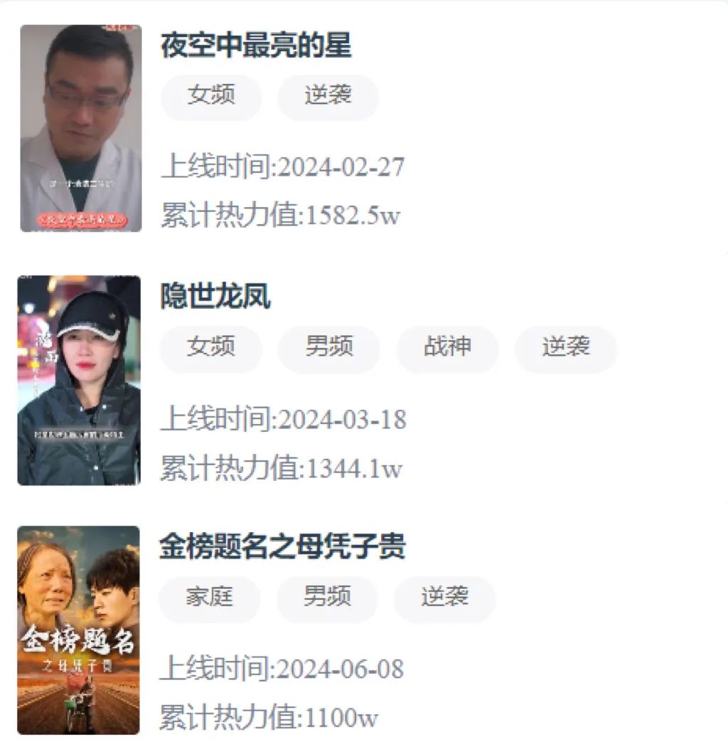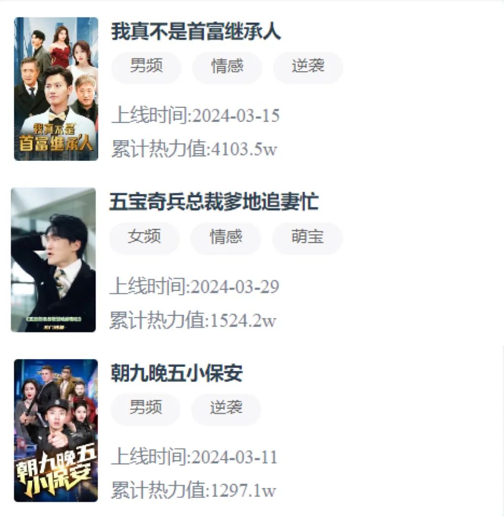 《等你回家》《朝九晚五小保安》《五宝奇兵总裁爹地追妻忙》《我瞎编功法你们怎么都成仙了》等短剧热力值均突破千万,其中《我真不是首富继承人》热力值超过4000W。半年内出现了两部热力值超4000W的短剧,奠定了其登顶热力值榜的基础。