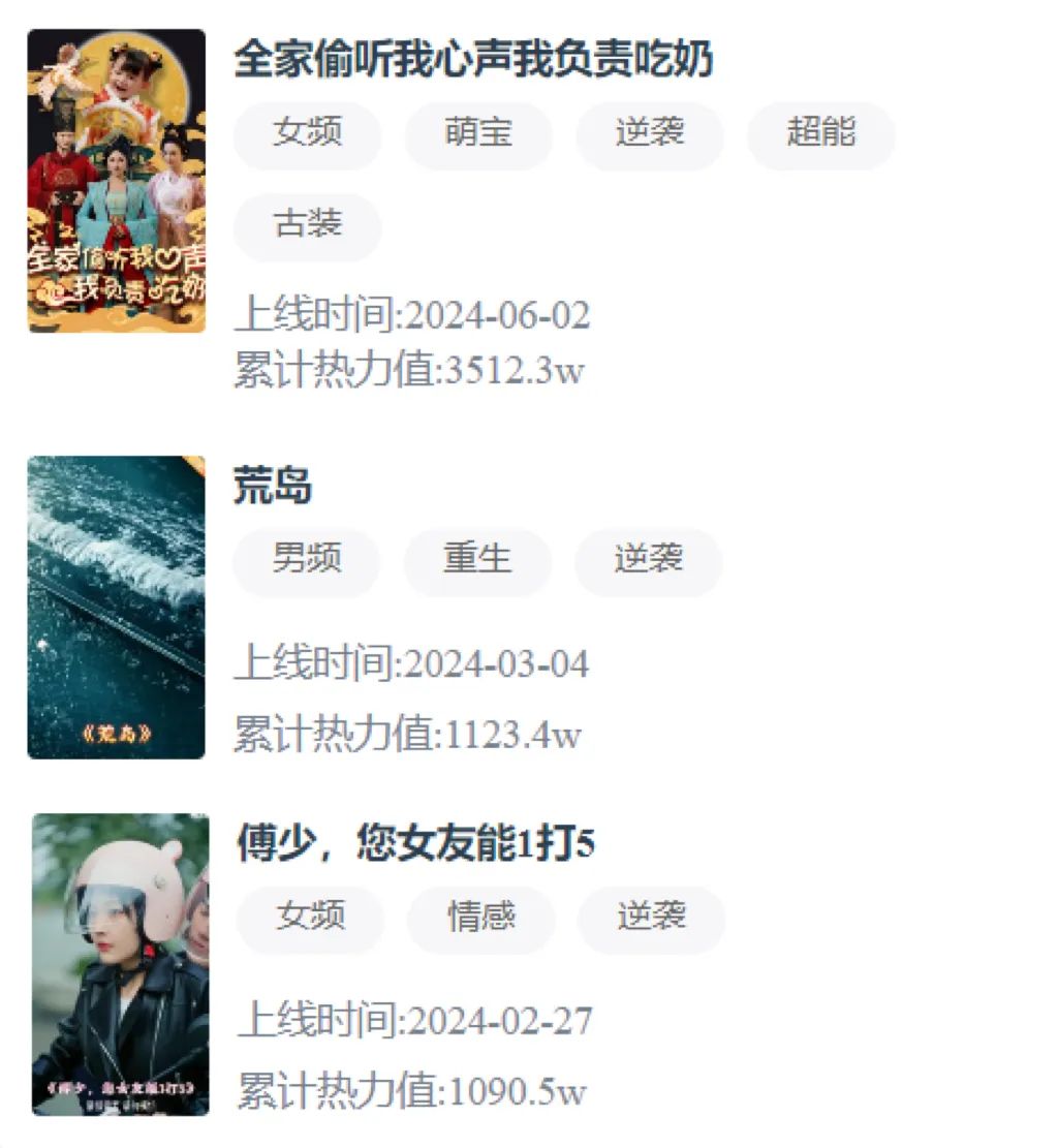 1-6月,大鱼小娱上线的《九品县令》《傅少,您女友能1打5》《荒岛》等短剧热力值均超千万,其中,6月上线的《全家偷听我心声我负责吃奶》热力值接近3500W。