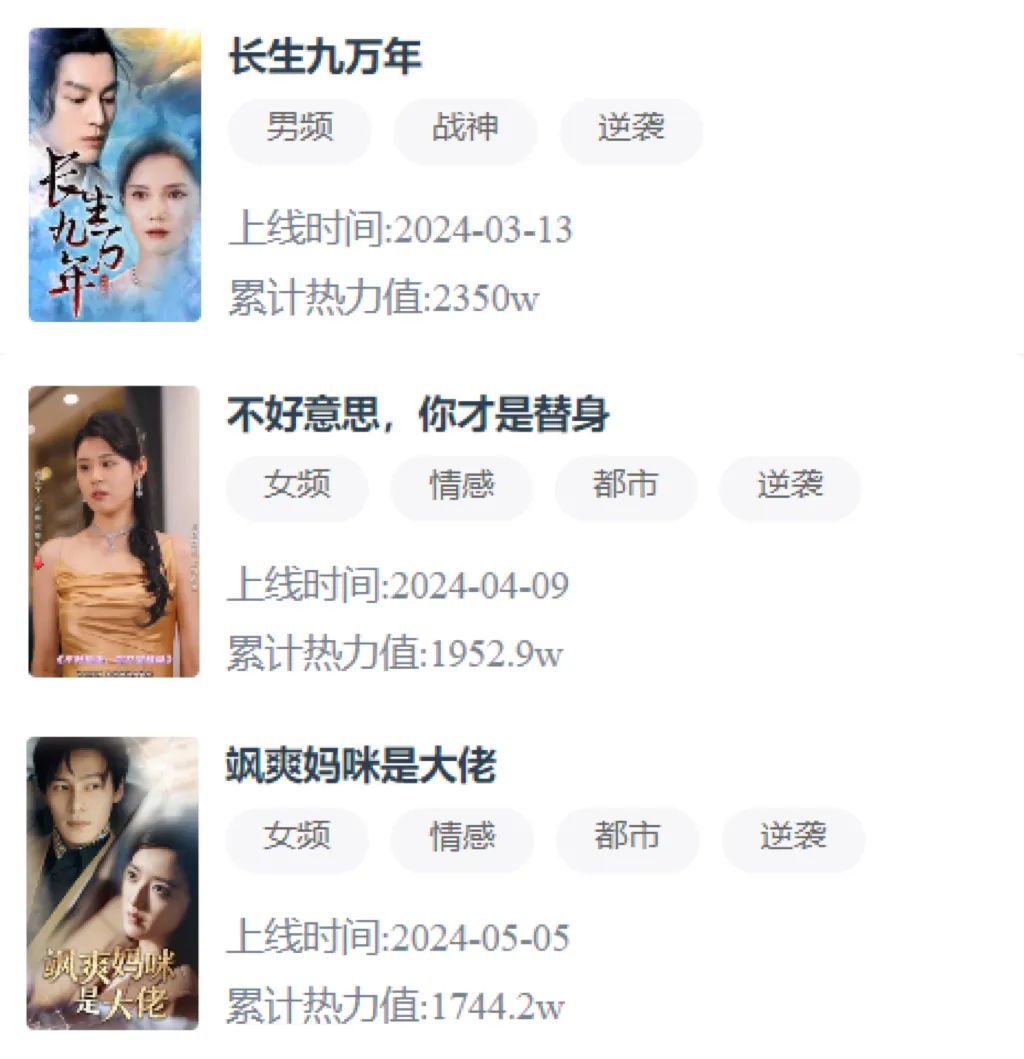 值得注意的是,2-6月,风华正茂上线的新剧中,几乎每个月都会有一部累计热力值超千万。上半年,风华正茂共有《爱不单行》《长生九万年》《不好意思,你才是替身》《飒爽妈咪是大佬》4部短剧热力值超千万。