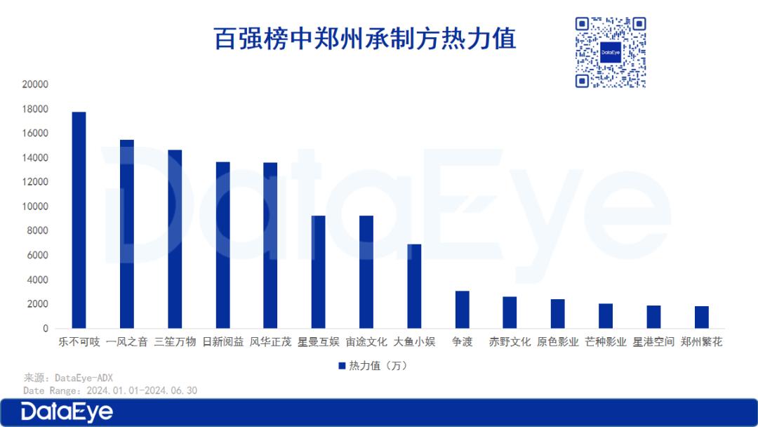 从郑州承制方上半年的热力值来看,乐不可吱和一风之音表现较为突出,二者是榜单中唯二热力值超过1.5亿的承制方。