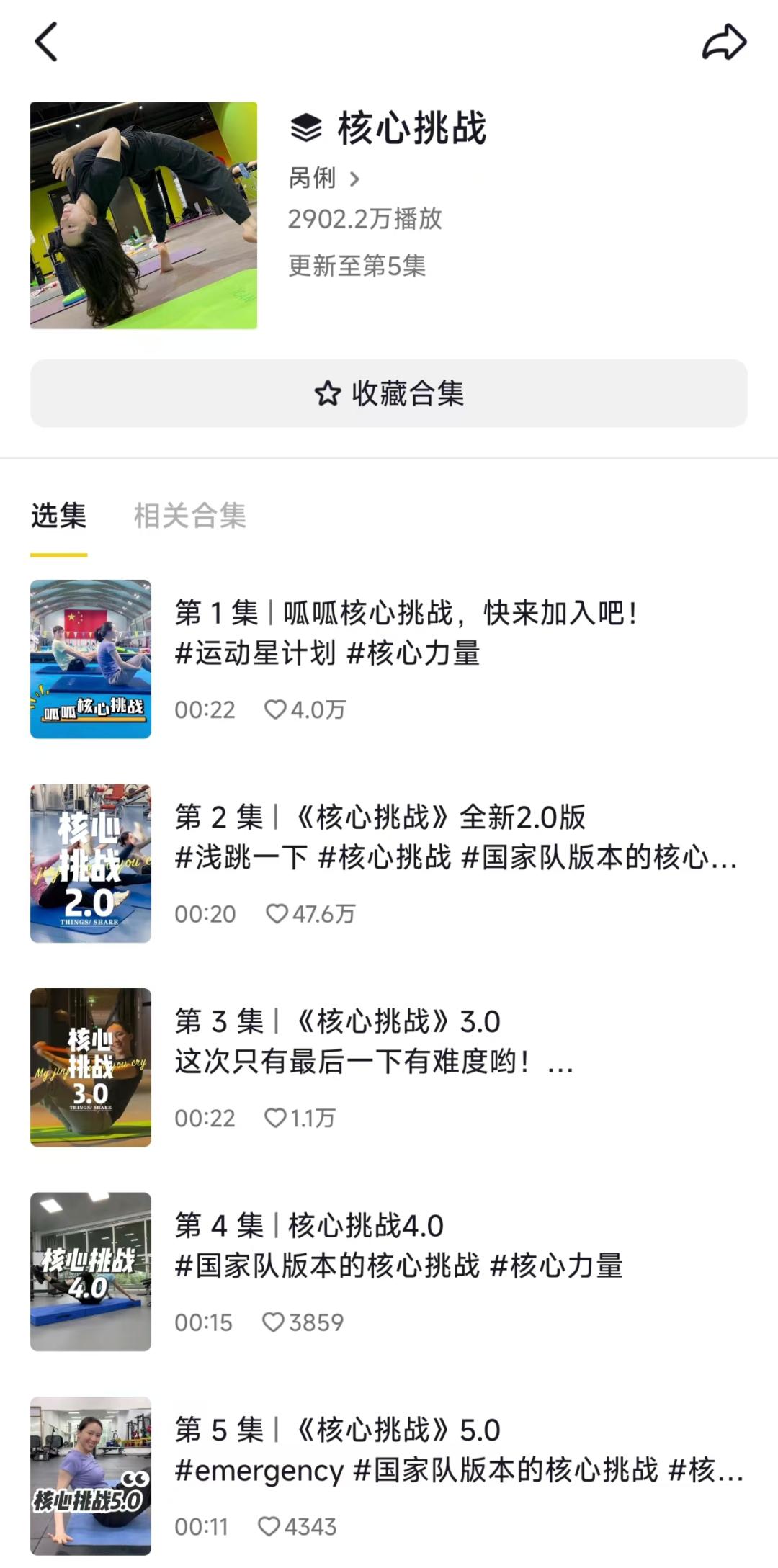 “呱呱核心挑战”出圈后,呙俐开始延续“核心挑战”系列内容,先后结合有趣的BGM创编了5套核心挑战动作,相关视频累积播放量达到超2900万。近日为庆祝中国游泳队夺冠,更是与队员们一起献舞,登上抖音娱乐榜,单条视频就获得了10万点赞。
