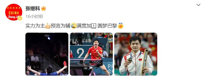 8月5日,巴黎奥运会乒乓球男单决赛上,樊振东以4-1击败莫雷加德,夺得金牌。前世界冠军张继科发文祝贺道:“实力为主,预言为辅,满贯加1,圆梦巴黎",此事迅速登上各大平台头条。