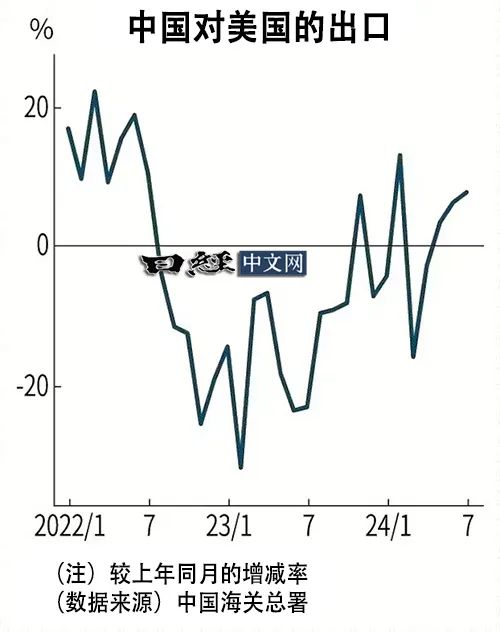 从单月对美出口数据来看,从2022年8月到2023年底,除2023年11月外,其余月份均为同比负增长。进入2024年后,5月之前,除2月外均为同比负增长,但5月以来转为正增长。7月的增幅相较于6月(6.6%)进一步扩大。